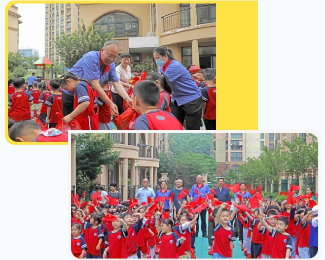 走進(jìn)幼兒園,恰逢升國(guó)旗儀式,張正和等肅然而立,行注目禮,共同參與這莊嚴(yán)的升旗儀式。小護(hù)旗手邁著鏗鏘有力的步伐,護(hù)送著鮮艷的五星紅旗步入升旗臺(tái),鮮艷的五星紅旗迎風(fēng)展開,全場(chǎng)小朋友唱起國(guó)歌,向莊嚴(yán)的五星紅旗行注目禮,莊嚴(yán)的氛圍感染著全園師生??粗⒆觽円粡垙堊孕趴蓯鄣男δ槪趫?chǎng)眾人為孩子們擁有如此美好的童年感到欣喜與欣慰,紛紛為可愛的孩子們鼓掌點(diǎn)贊。