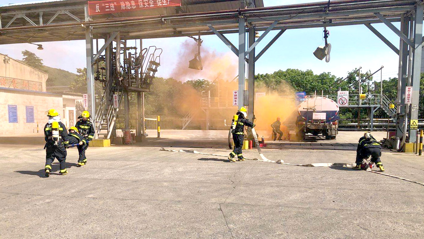 專項演練由保衛(wèi)處牽頭聯(lián)合有機分廠、生產(chǎn)安環(huán)部等單位開展。演練模擬有機分廠液化工段卸料站裝卸區(qū)槽罐車因駕駛不當,撞擊到另輛正在進行卸料作業(yè)的槽罐車上,造成現(xiàn)場車輛車尾管道破裂,大量的物料從破裂口處流淌在地面上,流淌的液體遇火花,造成流淌火并引燃槽罐車,火勢迅速向四周擴散,當班人員無法撲滅,情況緊急。