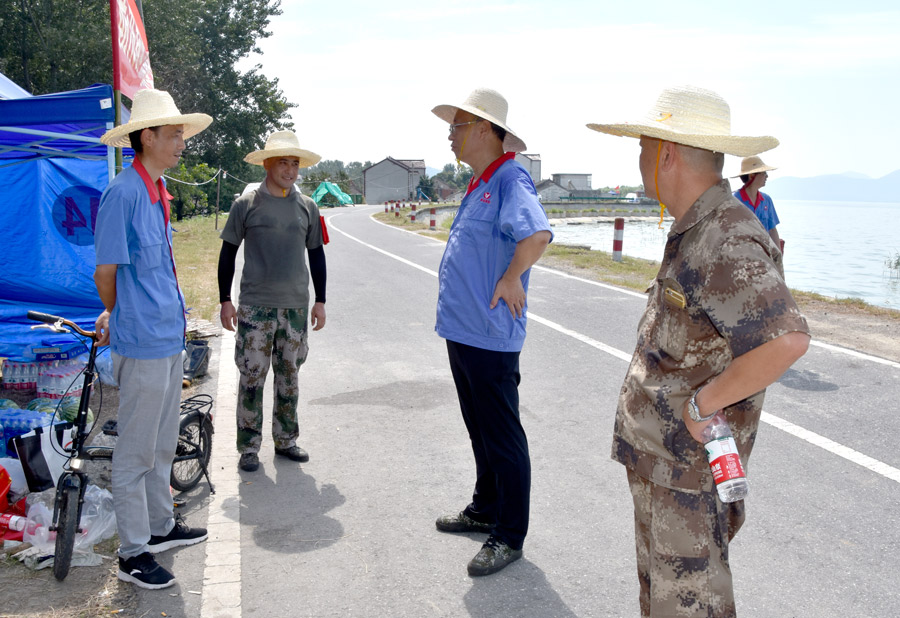 8月3日,驕陽似火,巢湖地區(qū)高溫度達(dá)36℃。在如此炎熱的天氣里,皖維防汛突擊隊(duì)員們的身體狀況讓公司導(dǎo)時(shí)刻記掛在心。這樣的高溫下,突擊隊(duì)員狀態(tài)怎么樣?隊(duì)員們有哪些實(shí)際需要?上班,張正和、吳霖、閆昌斌等導(dǎo)就驅(qū)車前往巢湖大堤,慰問防汛線的突擊隊(duì)員們。