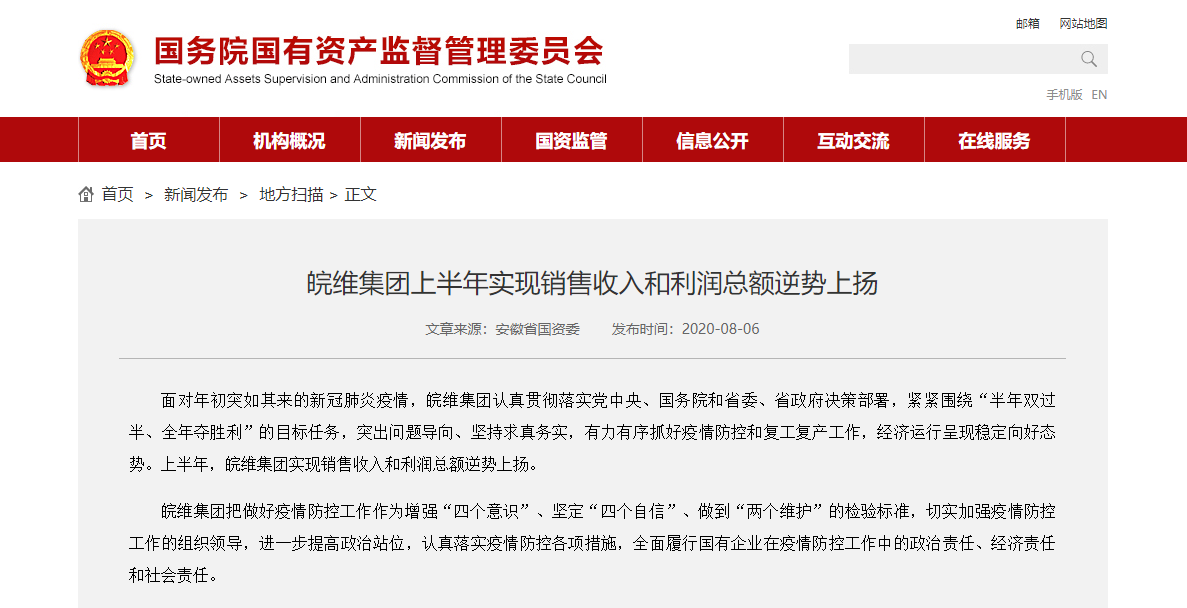 繼省國資委公眾號全景式報道公司上半年生產(chǎn)經(jīng)營后,日前,國務(wù)院國資委網(wǎng)站地方掃描欄目也以《皖維集團上半年實現(xiàn)銷售收入和利潤總額逆勢上揚》為題進行報道。