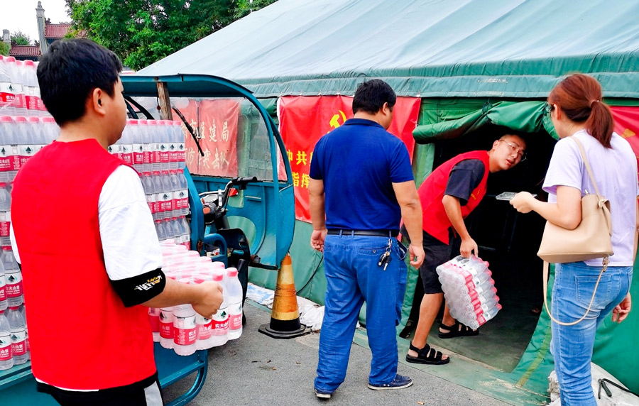 在得知這消息后,公司團委迅速行動,利用之前募集的愛心善款購買了100箱礦泉水,并組織志愿者送到防汛人員手中。