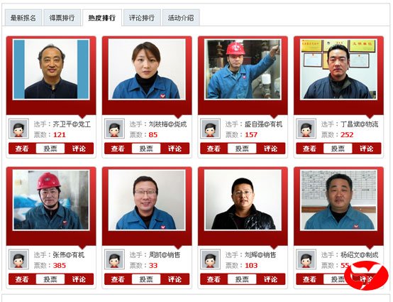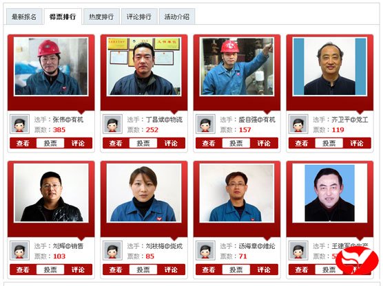 截止12月17日8:00時(shí),評(píng)選活動(dòng)歷時(shí)整整24小時(shí),有機(jī)分廠張偉得票385,為16日的得票王;黨委工作部的齊衛(wèi)平人氣關(guān)注度1177,是16日的人氣王。兩項(xiàng)指標(biāo)的前8名見下圖。